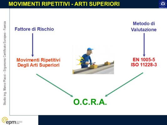 Per la valutazione del Rischio da Movimenti Ripetitivi è stato utilizzato il metodo OCRA, pubblicato nel 1996 dai Proff. Colombini ed Occhipinti dell’Ente Postura e Movimento di Milano; successivamente da loro modificato e migliorato nel 1999 e nel 2003.